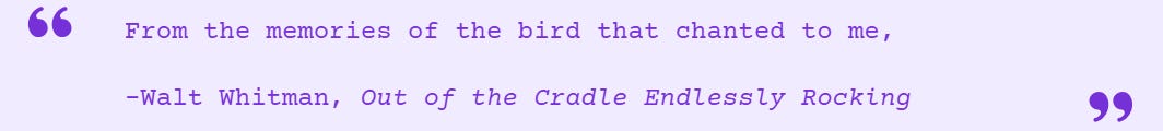 Issue #0 explored strangeness and Wallace Stevens. Issue #1 I have just explored nature and Walt Whitman. The next issue: SBR #2 (October), will focus on love poems, timed with my wife and I’s anniversary and I will do a deep dive on a secret poet; subscribe to find out who!