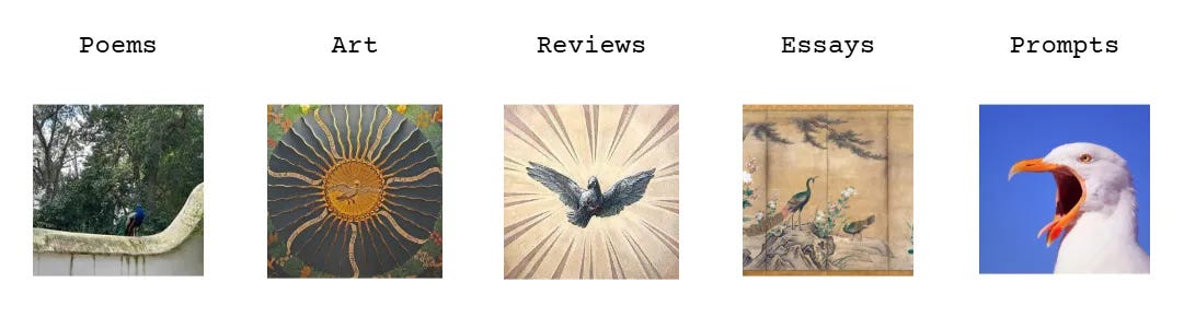 Welcome to the first week of September and to the first official issue of SBR or Strange Bird Reviews (Strange, Bird Reviews). This is my digital publication. My preferred way to share my works as opposed to the weekly one poem (or sometimes two) a week. In this issue, I will share essays, prompts, and most importantly poetry: both new and classic from my Substack history. This month, the theme is autumn, nature, traffic.