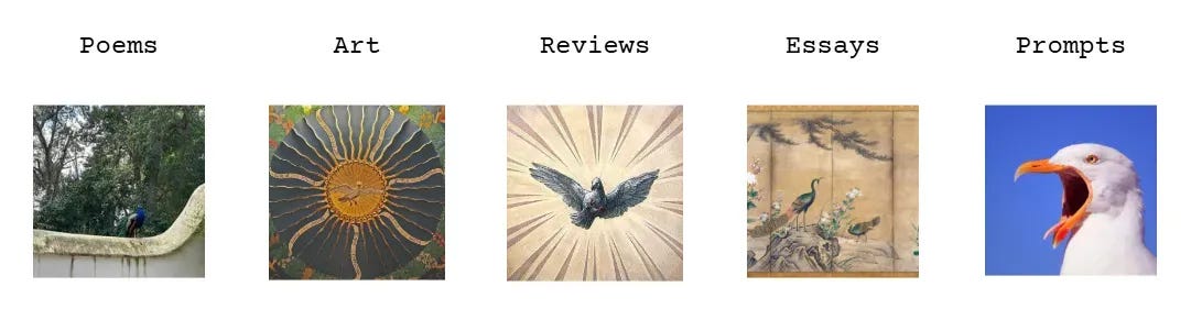 Welcome to the second edition of Strange Bird Reviews, my digital journal. In this issue I will share essays, prompts, and poetry, both new and classic from my Substack archives.